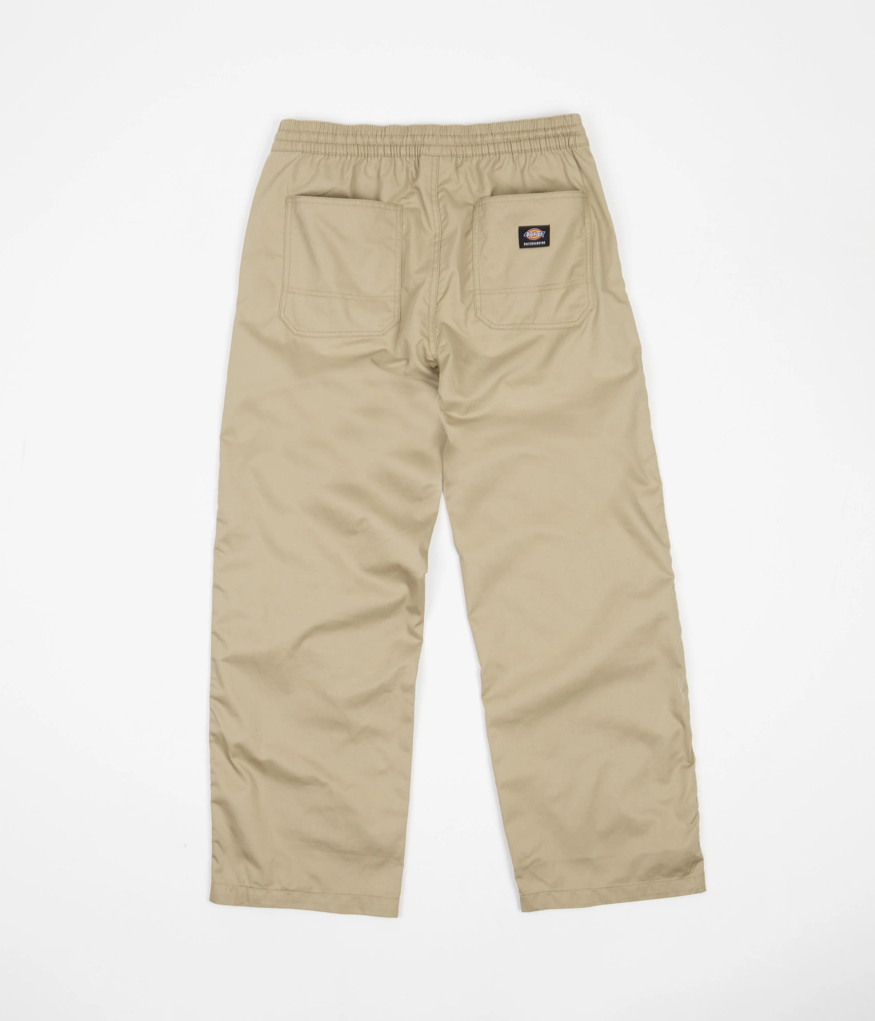 Dickies Mount Vista Pants in Khaki. Crafted from 100% recycled flex cotton twill with a hard wearing 210gsm composure, these relaxed fitting Dickies pants are designed with skate-centric functionality in mind. With a woven elastic waist, double knee panels and reinforced stitched seams throughout, these straight leg pants also feature two side entry pockets and two patch style pockets on the reverse for increased everyday function. Signed off with an embroidered ‘Dickies Skateboarding’ flag label across the rear, with an additional Dickies flag label sewn across the front of the left leg for further textured depth.