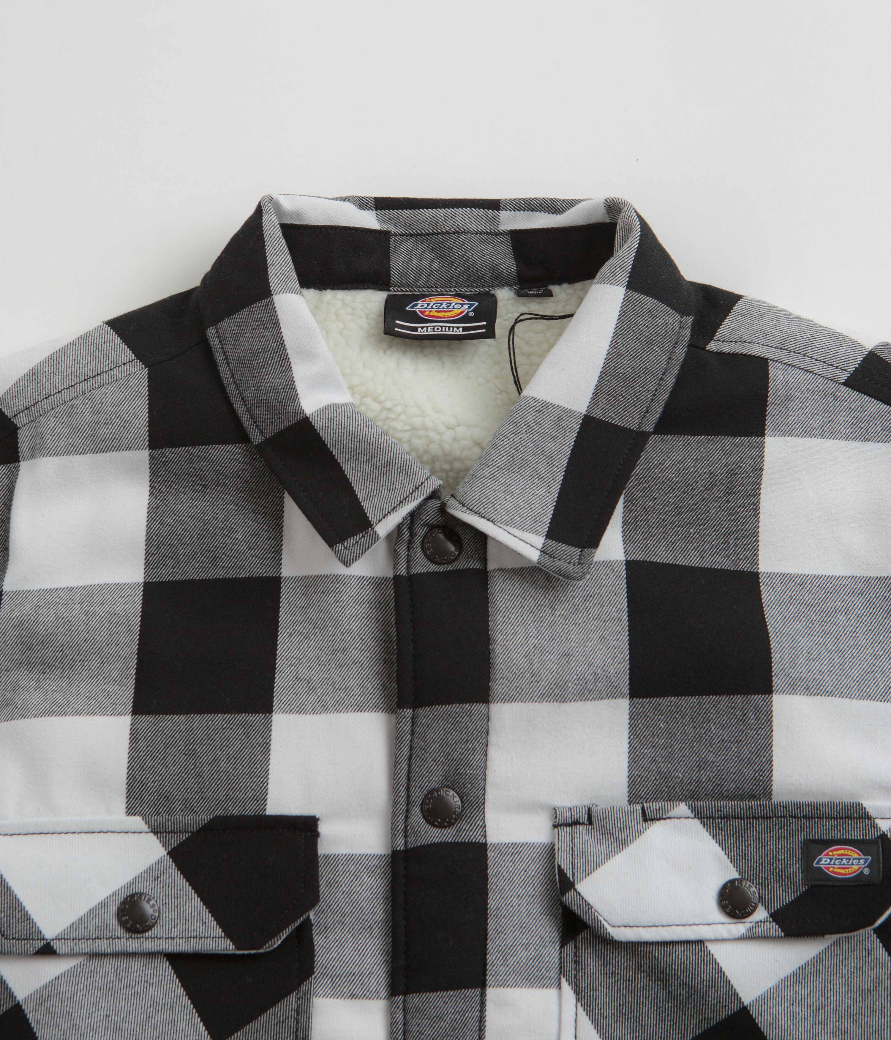 Dickies Sherpa Lined Sacramento Shirt in Black. Inspired by classic workwear aesthetics with its two tone checkered colourway, this new season Dickies shirt is tailored to a regular fit from 100% premium cotton for an insulative day on day wear. Styled with a premium Sherpa fleece lined interior for increased heat retention, this long sleeve layer features a reinforced hemline, button adjustable cuffs and a full length 6 snap popper fastening that flows through the immediate centre of the chest from the classic pointed collar neckline. Two side entry hand warmer pockets are mirrored by two spacious button-down pockets across the upper chest, whilst the traditional ‘Dickies’ flag label trim seals the design with an additional layer of textured depth.