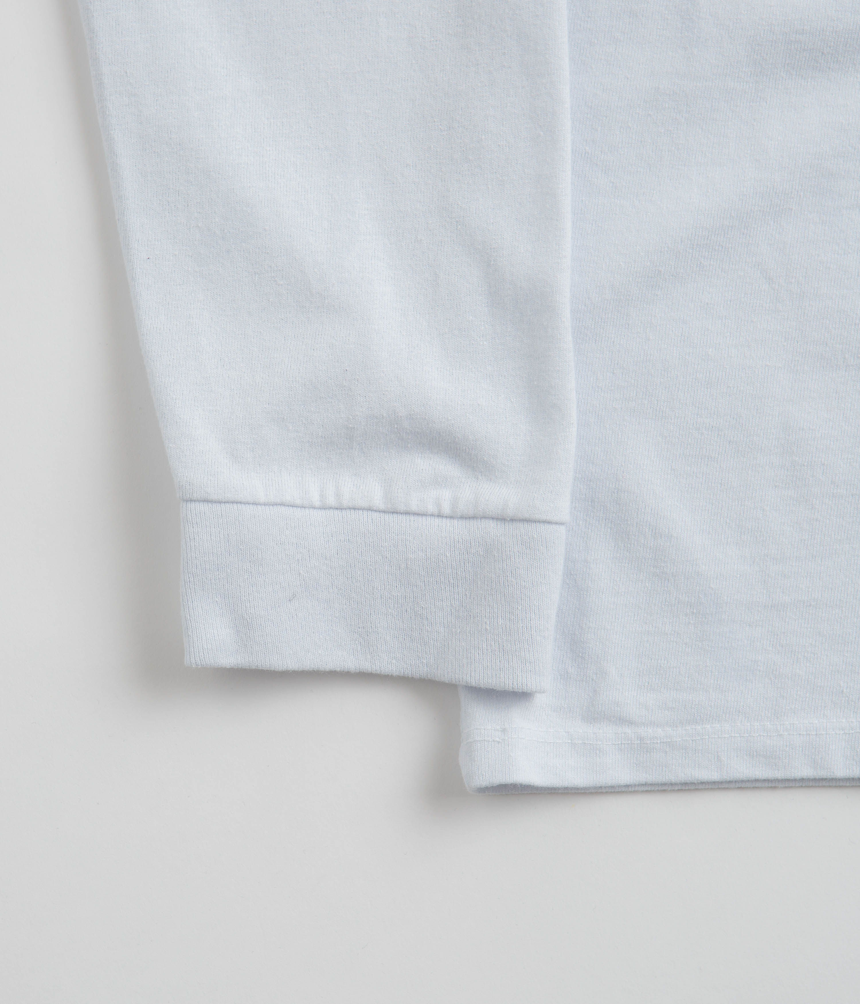 - Rib knit crew collar, taped shoulder seams and ribbed cuffs